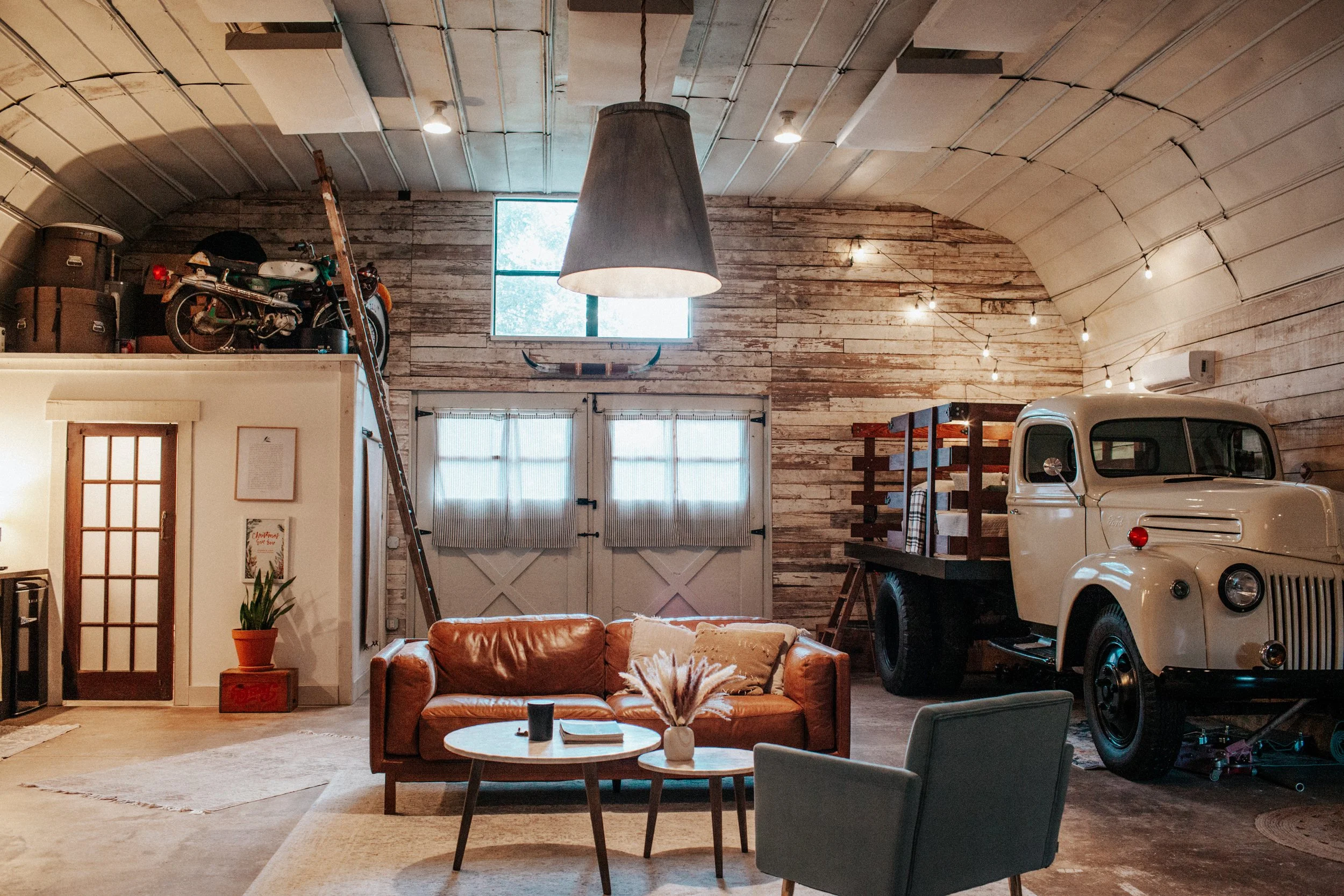 The building itself is a steel and metal frame with an open floor plan studio design. We aimed for an "aged rustic" feel in the barn, so we thought beyond conventional materials and sought ones that could be repurposed or might not typically find a place in an interior space. The walls are adorned with poplar that was reclaimed from scrap wood at an Amish mill in Kentucky. The west wall features 100-year-old tongue and groove wood that was salvaged from the roof of an industrial warehouse in downtown Jacksonville. The interior roof boasts aged metal from a warehouse roof in Green Cove Springs.
